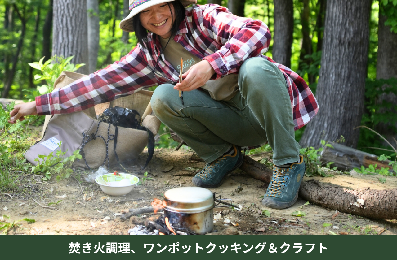 自然の中で命を繋ぐ為に必要な技術、知識を一通り身につけます。道具を減らす分、自然の力を自分の生きる力に変えます。