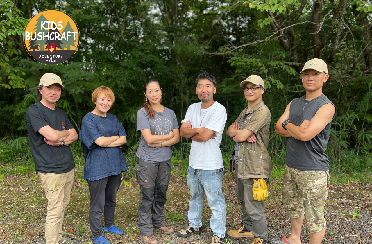 右から3番目が小池さん。スタッフ全員が当校認定インストラクターさんです。子供のためのブッシュクラフト&防災教育を展開しています。